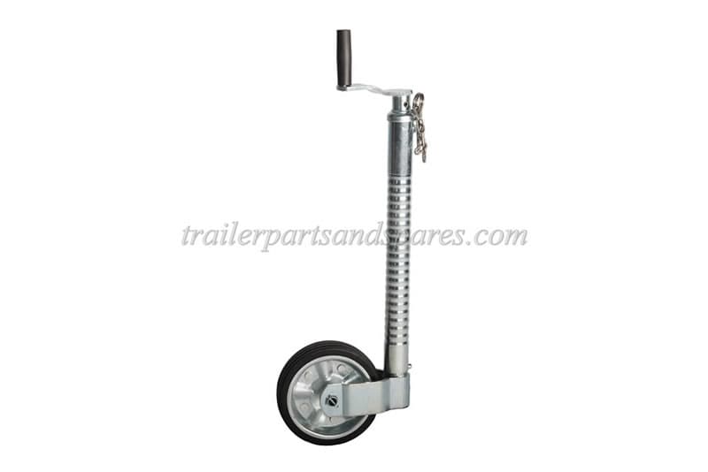 Heavy duty jockey wheel 48mm dia. 200mm steel wheel with solid rubber tyre, max nose weight 350kg. Lower winding handle 160mm
